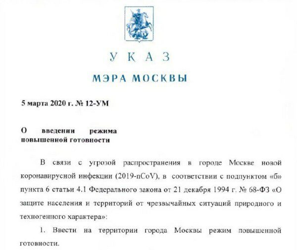 Мэр Москвы Сергей Собянин подписал указ о введении режима повышенной готовности из-за угрозы распространения в столице новой коронавирусной инфекции.