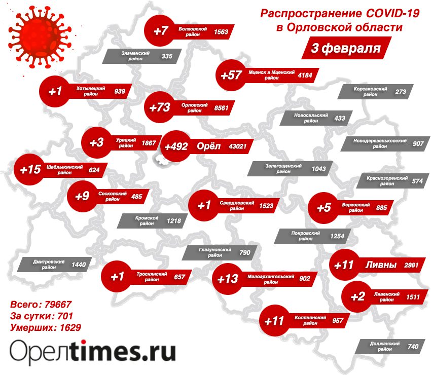 За прошедшие сутки положительный тест на коронавирус получили 701 человек – очередной отрицательный рекорд для Орловской области. Всего за время пандемии заразились 79667 орловцев.
