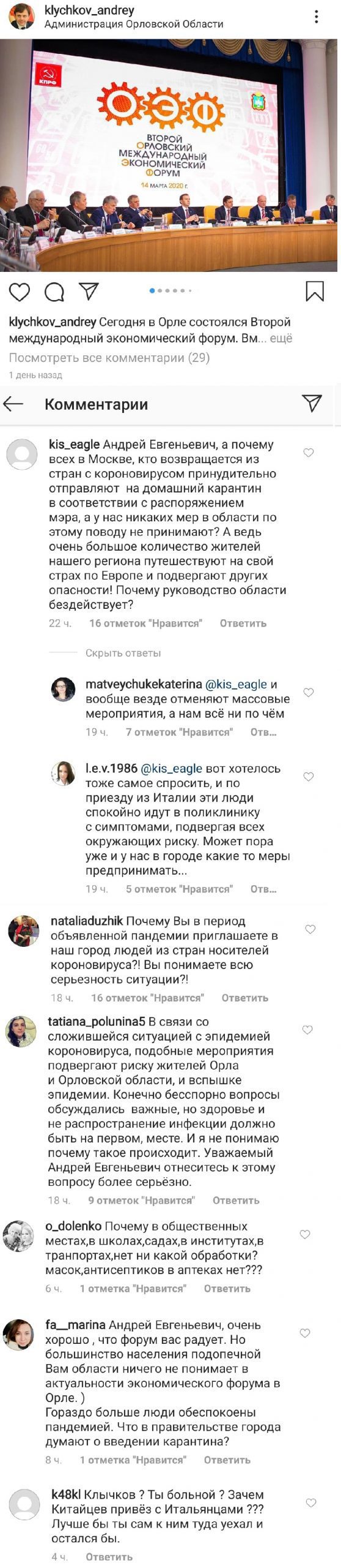 Людей интересовало, что в правительстве региона думают о введении карантина. Также орловцы без лишнего стеснения спрашивали: понимает ли губернатор всю серьёзность ситуации. Впрочем, пока губернатор на возмущённые комментарии орловцев никак не отреагировал.