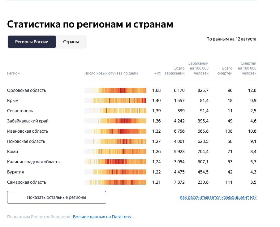 Орловская область по состоянию на 12 августа оказалась на первом месте в РФ по скорости распространения коронавируса. Об этом пишет ИА «Общественная служба новостей» со ссылкой на данные Роспотребнадзора. На втором месте — Республика Крым.