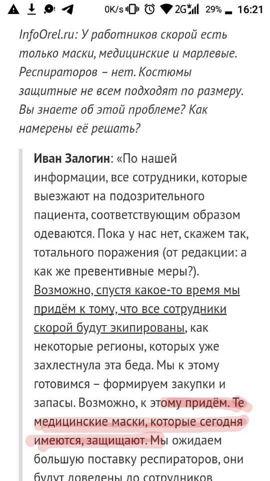 Буквально накануне жена орловского врача больницы Семашко, которая одна из первых призвала медиков не замалчивать свои проблемы, сообщила о маленькой, но такой важной победе в борьбе за права медицинских работников, в том числе, и по части обеспечения их СИЗами. Напомним, 10 мая в область пришла партия костюмов и масок. При этом, уже тогда координатор регионального независимого профсоюза работников скорой помощи «Действие», фельдшер Дмитрий Серёгин отметил, что, по сути, область опоздала с защитой. Основная партия костюмов поступила только в начале мая, после того, как произошло массовое заражение медиков в орловских больницах и на «скорой».