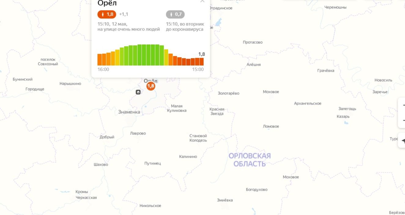 «Яндекс» составил рейтинг самоизоляции, который снова бьёт антирекорды. По состоянию на 15:10 индекс самоизоляции в Орле достиг отметки 1.8. В полдень он составлял 1.6. К слову, чем выше цифра, тем меньше людей на улице.