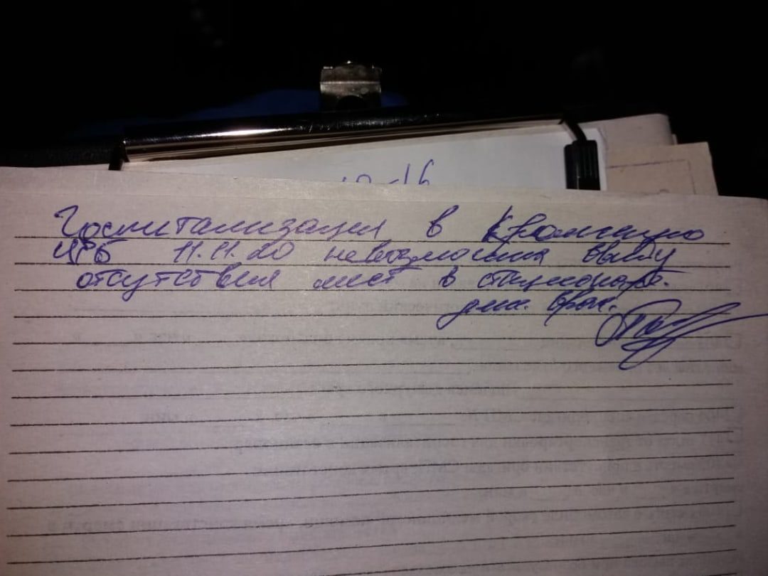 Об этом «Орелтаймс» сообщил фельдшер, координатор профсоюза независимых медиков «Действие» в Орловской области Дмитрий Серёгин. В доказательство он привёл выписку из документов о «невозможности госпитализации в Кромскую ЦРБ по состоянию на 11.11.2020».