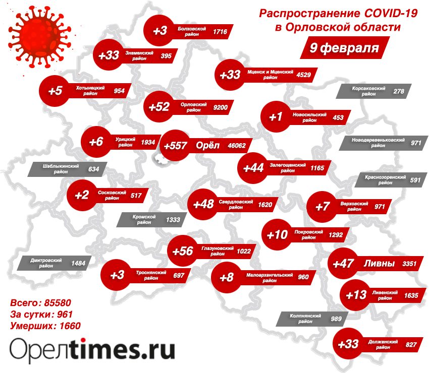 По состоянию на 9 февраля инфекция выявлена у 961 орловца. Госпитализирован 151 человек. Выздоровело 287 жителей.