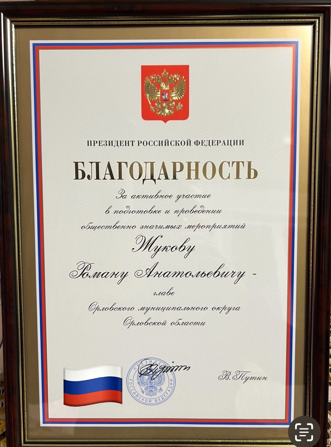 Бывший глава Орловского муниципального округа Роман Жуков разместил в своих соцсетях благодарность от главы государства Владимира Путина. Внимания президента экс-чиновник удостоен «за активное участие в подготовке и проведении общественно значимых мероприятий» в бытность главой округа.