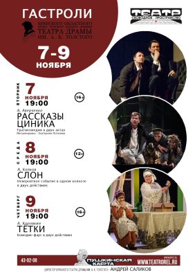 После ноябрьских праздников в Орёл с гастролями приедет Брянский театр драмы им. А.К. Толстого. Орловскому зрителю покажут комедии «Тётки», «Рассказы циника» и приключенческую историю «Слон».