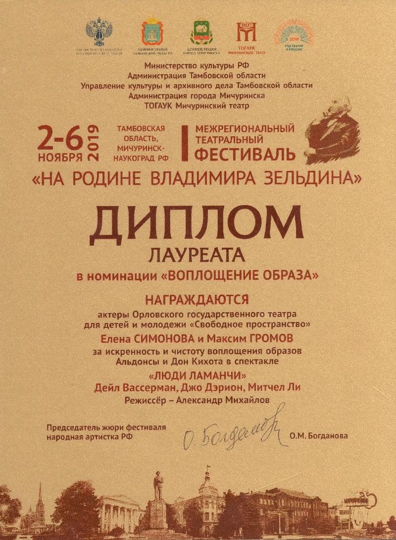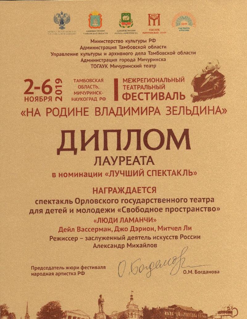 Единогласным решением жюри спектакль «Люди Ламанчи» (режиссёр-постановщик — заслуженный деятель искусств России Александр Михайлов) Орловского театра «Свободное пространство» признан лучшим – сообщается на сайте театра.