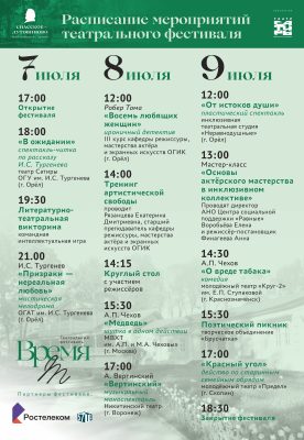 В тургеневскую усадьбу приедут МВХТ им. Чеховых (г. Москва), Никитинский театр (г. Воронеж), молодёжный театр «Предел» (г. Скопин), молодёжный театр «Круг-2» им. Е.П. Ступаковой (г. Краснознамёнск), театр Сатиры ОГУ им. Тургенева, ОГАТ им. Тургенева, инклюзивная театральная студия «Неравнодушные» (г. Орёл) и др.