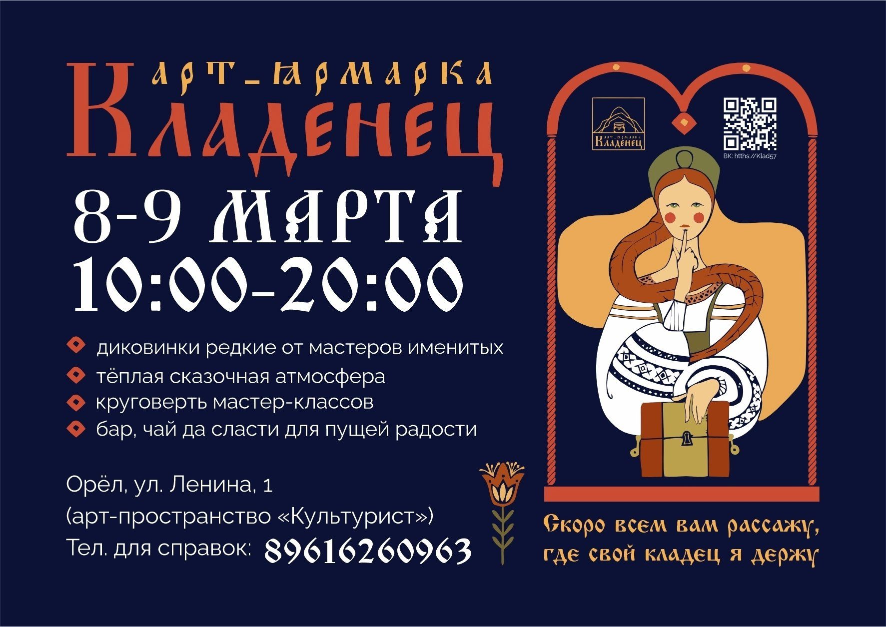 Отметим, что организаторами проекта выступают социальный предприниматель Дарья Зотова и керамист Татьяна Шалаева при поддержке арт-пространства «Культурист». Место проведения: Орёл, улица Ленина,1. Записаться на мастер-классы и получить более подробную информацию о программе мероприятия можно в официальном сообществе арт-ярмарки https://vk.com/klad57 и по телефону +79616260963. Возрастное ограничение: 6+.