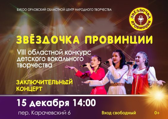 В Орле 15 декабря пройдёт финал VIII областного конкурса детского вокального творчества «Звёздочка провинции». Юные дарования региона выступят на сцене Орловского областного центра народного творчества.
