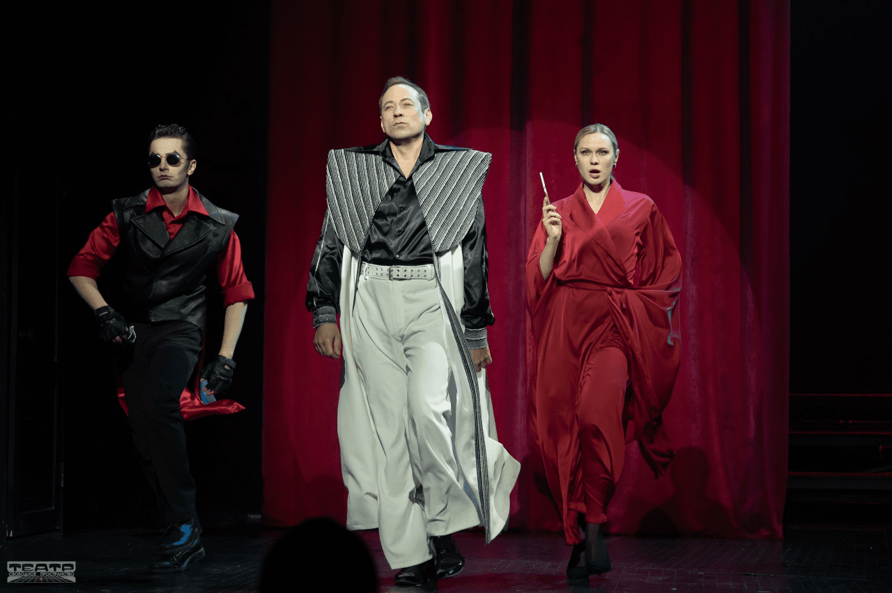 Сердечный «друг баронессы» адвокат (ярко гротескная роль Евгения Винника: неожиданный грим, костюм гангстера-экстремала, брови домиком) напомнит вампира, сосущего кровь богатых клиентов.