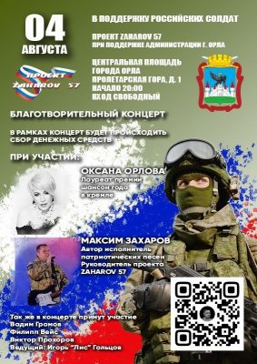 4 августа в городе Орле пройдёт благотворительный концерт в поддержку российских солдат, принимающих участие в специальной военной операции.