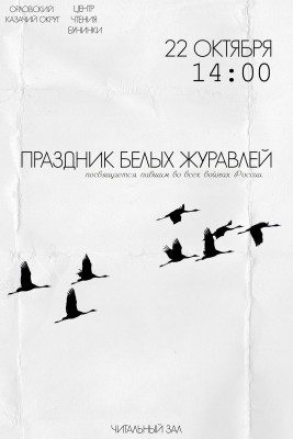 В память о воинах, павших за Отечество, в читальном зале Орловской областной библиотеки им. И.А. Бунина пройдёт праздник белых журавлей. Начало мероприятия в 14 часов. К участию приглашаются орловцы старше 10 лет.