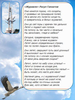 Автор красноречиво предположил, что солдаты не умирают на поле боя, а превращаются в журавлей, навечно оставаясь рядом с нами.