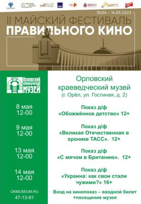 С 30 апреля по 14 мая 2023 года в Российской Федерации проходит II Майский фестиваль правильного кино. Он приурочен к празднованию Дня Победы. Орловцам правильное кино покажет Орловский краеведческий музей. Организатором фестиваля выступает Музей Победы.