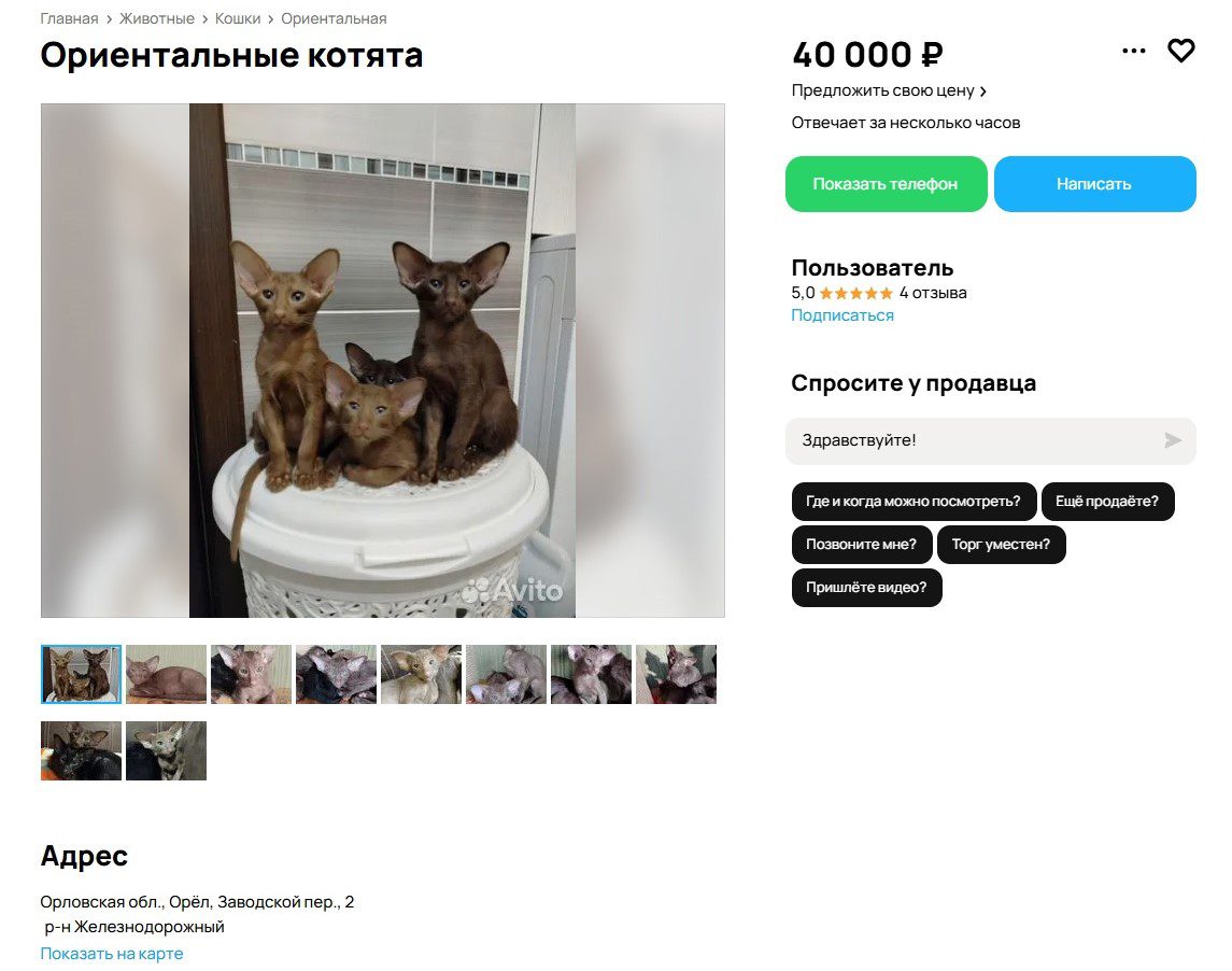 Котёнка-ориентала или даже взрослую особь в Орловской области можно купить по цене от 40 тысяч рублей. Нам удалось сразу три объявления о продаже в Железнодорожном и Советском районах Орла. Цена ориенталов растёт в зависимости от окраса. Самым дорогим является окрас «циннамон», напоминающий оттенок корицы. За такого котёнка просят 80 тысяч рублей.