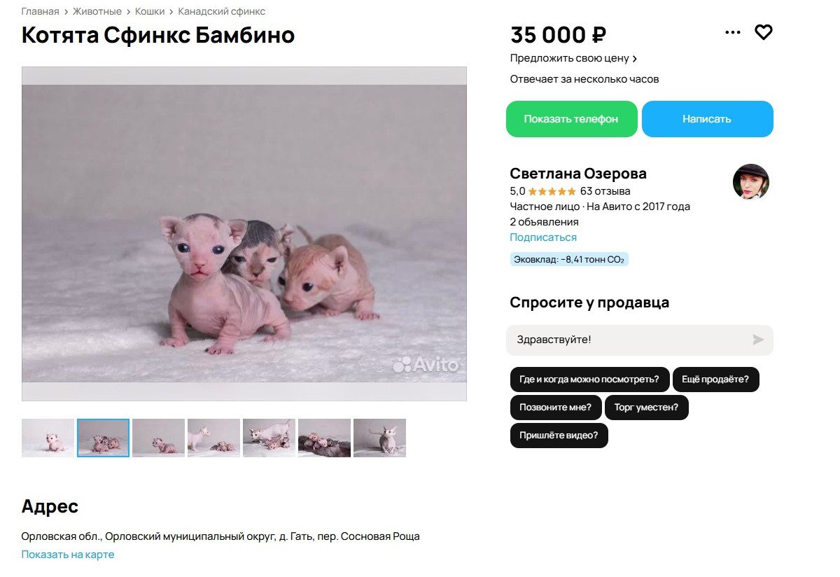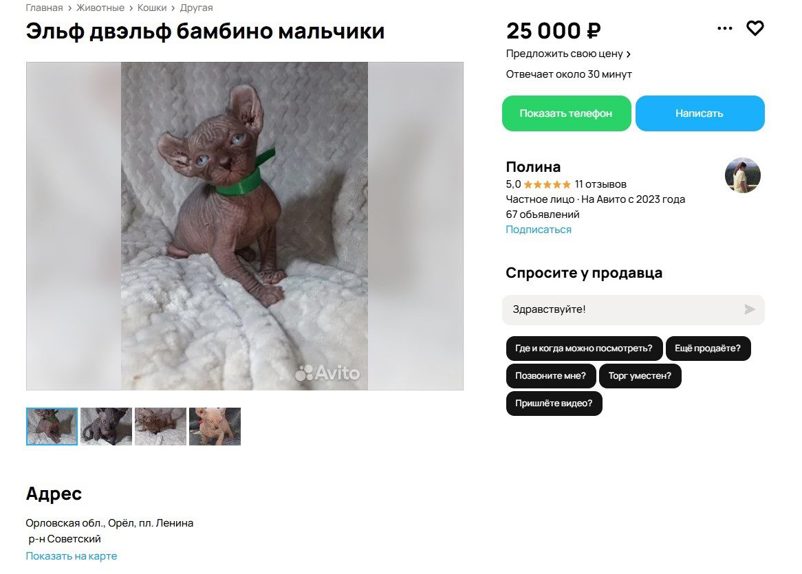 Лысые кошки – на любителя, но в Орловской области, судя по всему, их много. Объявлений об их продаже на сайте объявлений хоть отбавляй. Продавцы, помимо сфинксов, предлагают эльфов, бамбино, двэльфов.