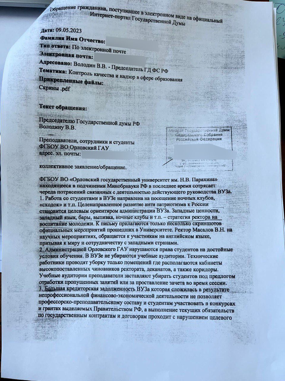 Однако, как удалось узнать ОрелТаймс, жаловаться на Владимира Масалова подчинённые начали задолго до обращения бойцов и их жён. Речь идёт о коллективной жалобе на действия ректора в Госдуму РФ.