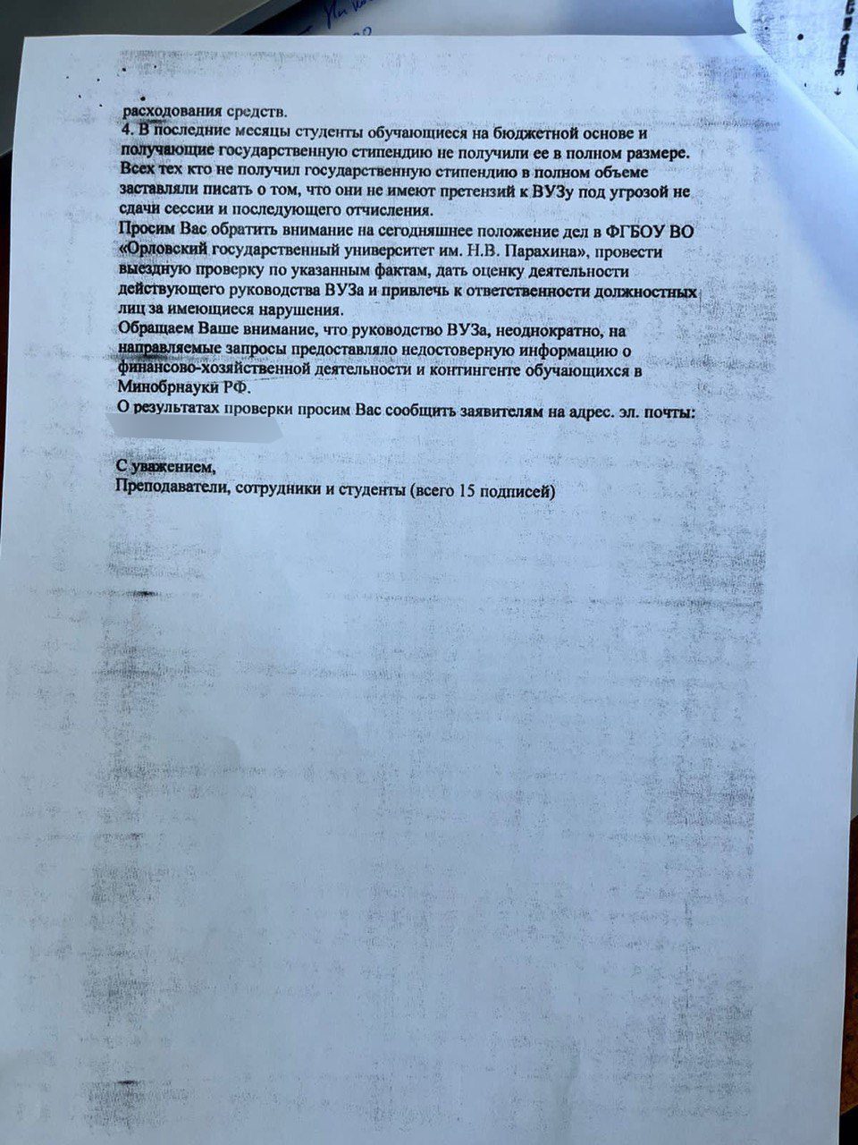 И, наконец, четвёртый пункт, из которого следует, что студенты, которые учатся на бюджетной основе, не всегда получают положенные им стипендии в полном объёме. «Всех тех, кто не получил госстипендию в полном объёме, заставляют писать (заявление – ред.), что они не имеют претензий к вузу. Тем, кто надумает ослушаться, угрожают отчислить по формальному основанию – несдачей сессии».