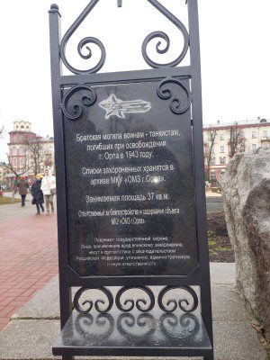 Данная табличка имеет надпись следующего содержания: «Братская могила воинам-танкистам, погибших при освобождении г. Орла в 1943 году».