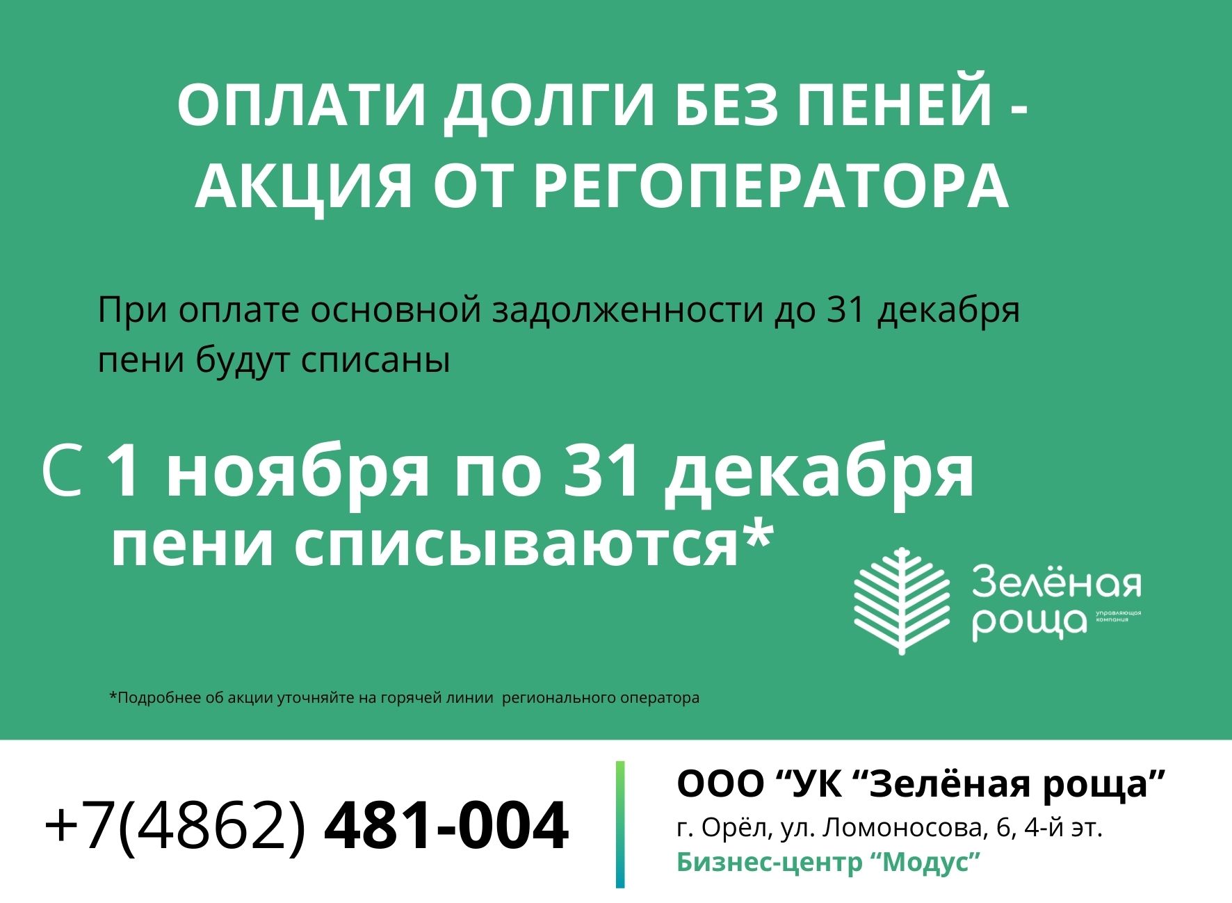 С 1 ноября по 31 декабря 2024 года ООО «УК «Зелёная роща» проводит акцию «Оплати долг без пени!», в рамках которой физические могут избавиться от начисленных пеней при погашении всей задолженности за вывоз ТКО. Чтобы принять участие в акции, физическим лицам нужно полностью оплатить долг и подать заявление о списании пеней.