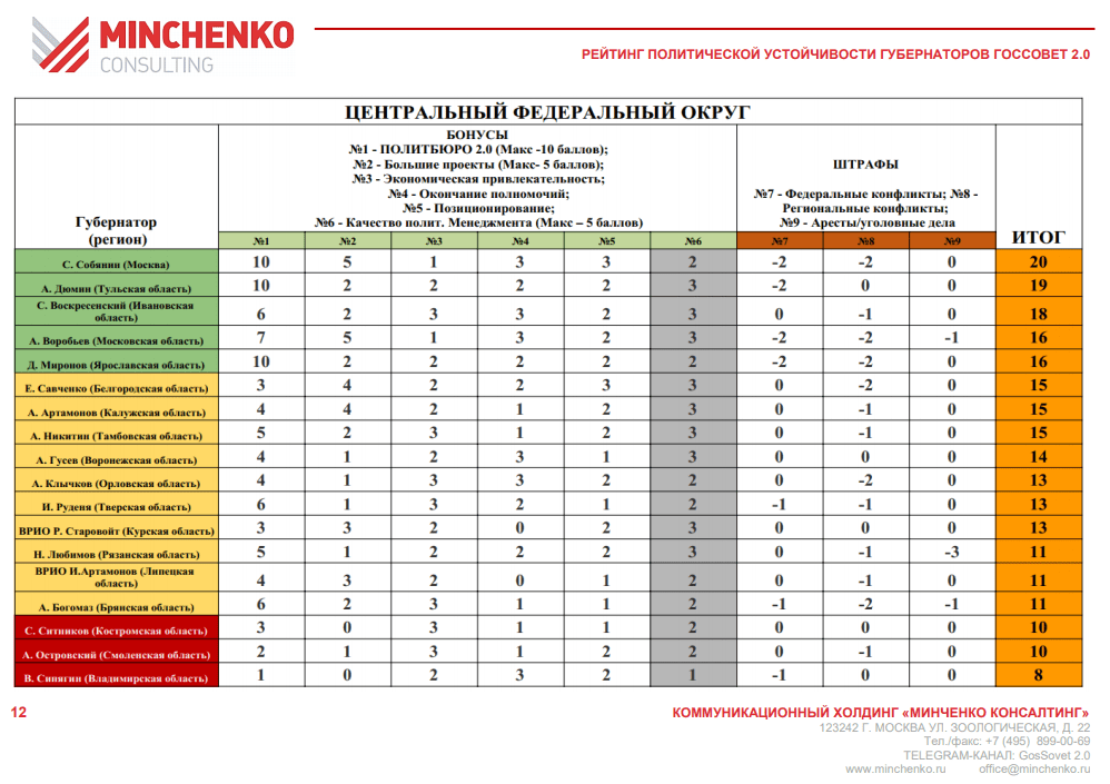Оценки главам или врио глав региона, данные политологами холдинга «Минченко консалтинг», включают в себя девять больших блоков с колебанием баллов от 0 до 5 (за исключением блока «Политбюро» (поддержка местной политической элитой), где максимально возможное количество баллов – 10):