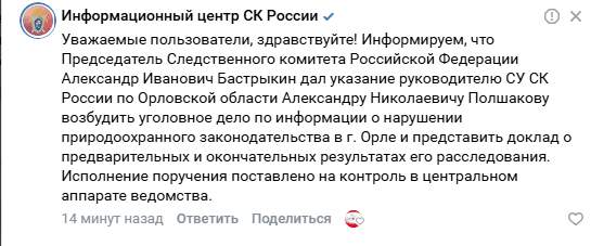 Председатель Следственного комитета Российской Федерации Александр Бастрыкин поручил руководителю СУ СК России по Орловской области Александру Полшакову возбудить уголовное дело по информации о нарушении природоохранного законодательства в Орле.