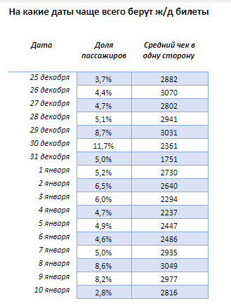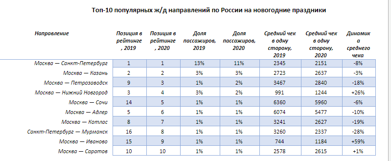 Заметно среди десятка популярных ж/д направлений на новогодний период выросли средние чеки по направлениям Москва — Иваново (+59%) и Москва — Нижний Новгород (+26%).