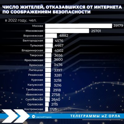 2115 жителей Орловской области сознательно не пользуются интернетом. Это около 0,1 % населения региона. По крайней мере, так указывает околоправительственный telegram-канал «Телеграммы иZ Орла».