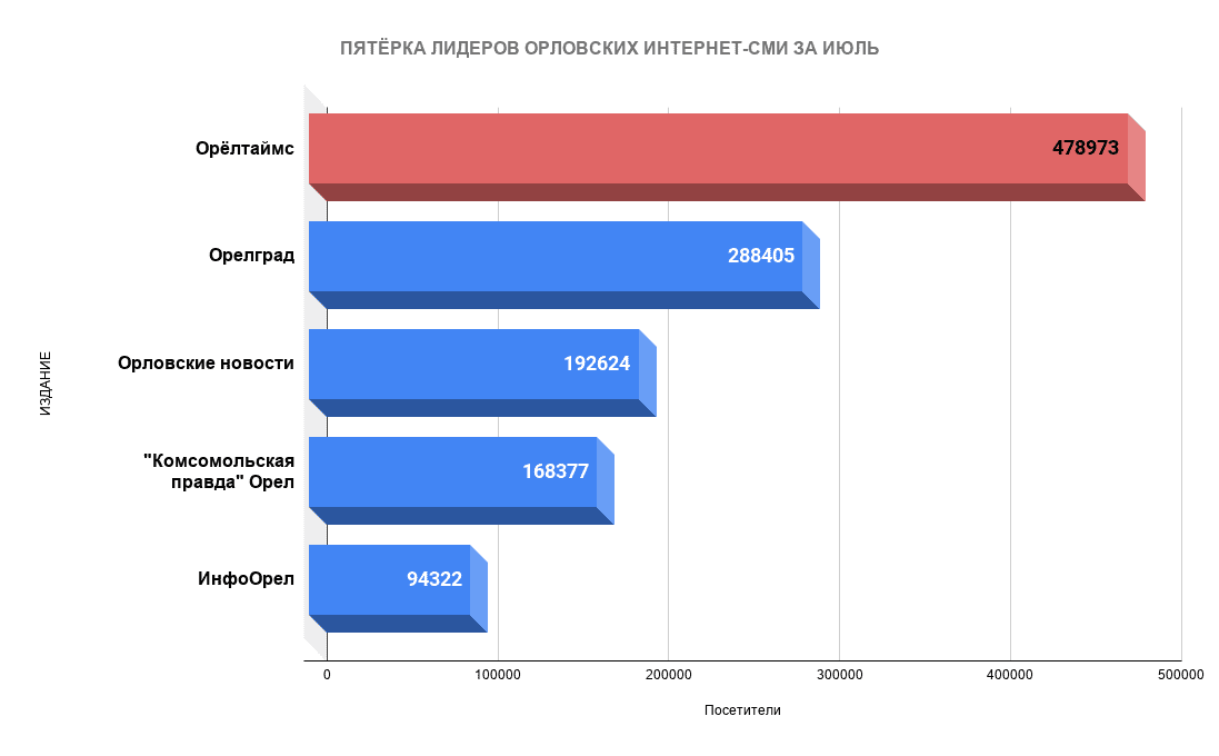 Лидирует «Орелтаймс» – почти полмиллиона «уников», а точнее – 478973 уникальных посетителей. По сравнению с июнем их число увеличилось более чем на 80 тысяч. На второй строчке «Орелград» с числом 288405 (минус почти 22 тыс. по сравнению с июнем). Третьи – «Орловские новости» – 192624 (минус 136 тыс. по сравнению с июнем). Затем идут «Комсомольская правда» Орел (168377) и ИнфоОрел (94322).