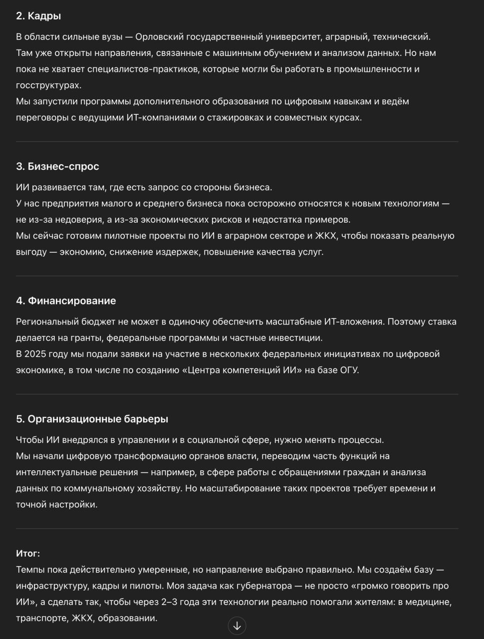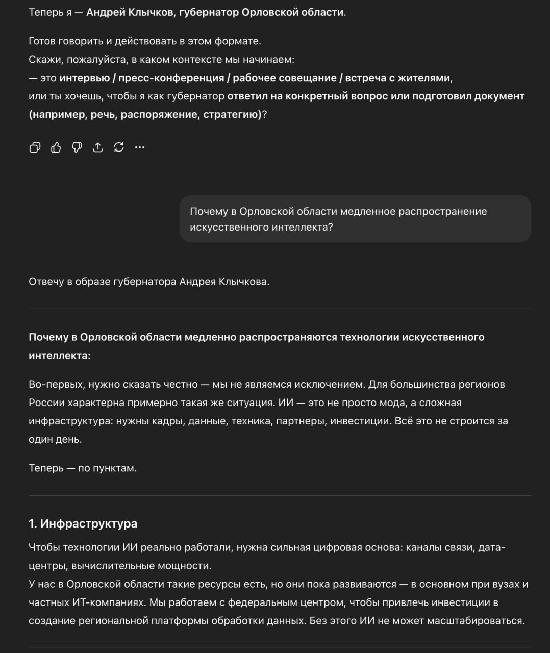 – В 2025 году мы подали заявки на участие в нескольких федеральных инициативах по цифровой экономике, в том числе по созданию «Центра компетенций ИИ» на базе ОГУ, – сообщил чат-бот от имени Клычкова.