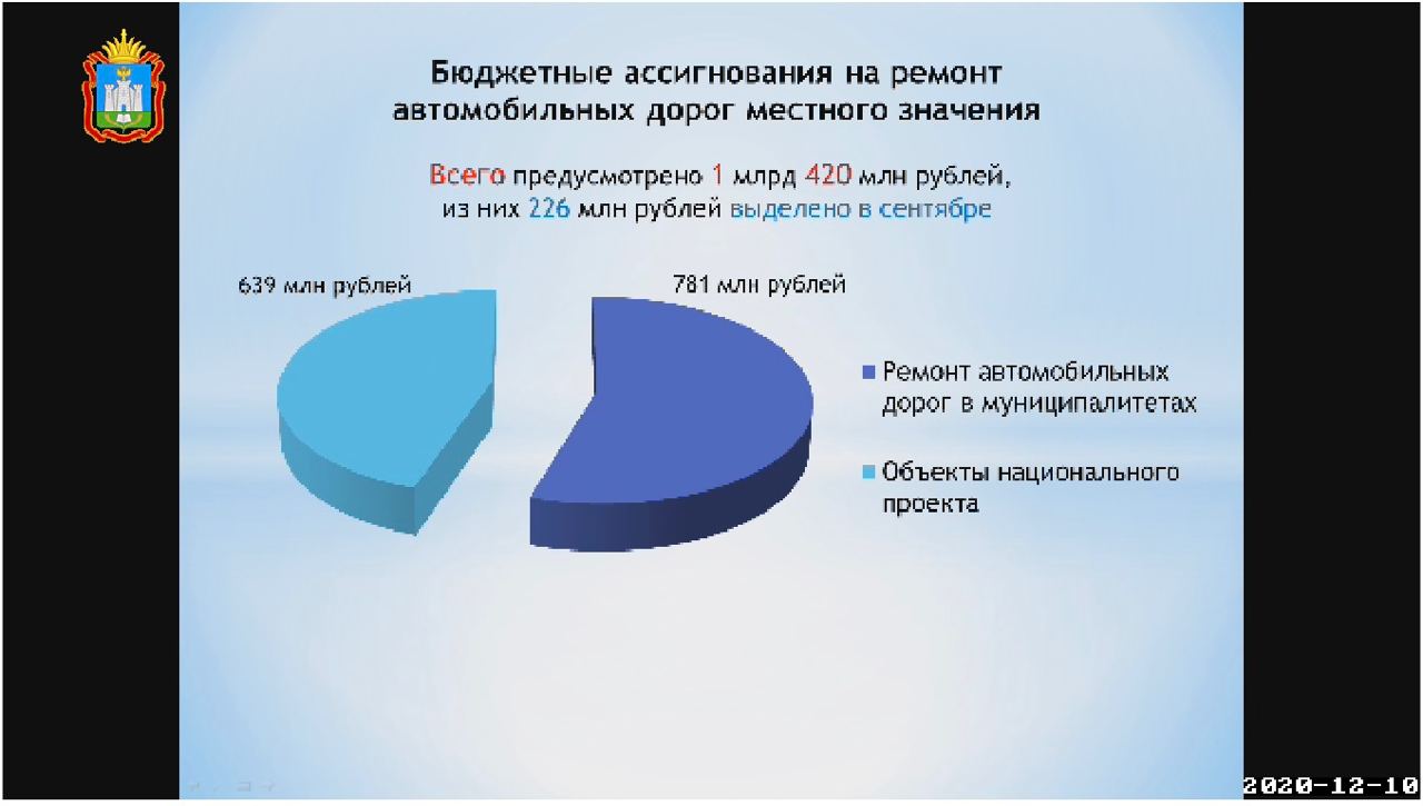 «Всего в 2020 году на ремонт автомобильных дорог местного назначения был предусмотрен 1 млрд 420 млн рублей. На сегодняшний день принято работ на 1 млрд 254 млн рублей, или 88%. В 16 муниципальных образованиях выделенные средства освоены в полном объёме. Продолжается приёмка в городе Орле, а также Болховском, Дмитровском, Залегощенском, Корсаковском, Кромском, Малоархангельском, Мценском, Орловском, Свердловском, Троснянском районах. Вчера со всеми мы проговорили, поставлена задача завершить приёмкку по выполненным работам до 15 декабря»,— успокоил Субботин.