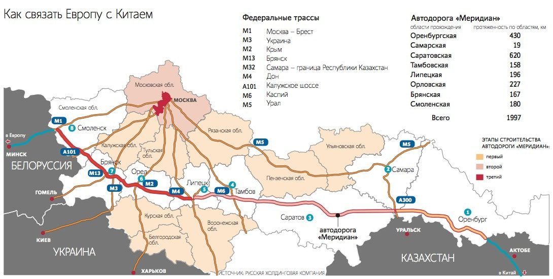 Автомагистралей, похожих на «Меридиан», в новейшей истории страны еще не строили: её протяженность – почти 2000 км – от границы Белоруссии до границы Казахстана. Дорога станет кратчайшим маршрутом для перемещения грузов между Китаем и Европой.