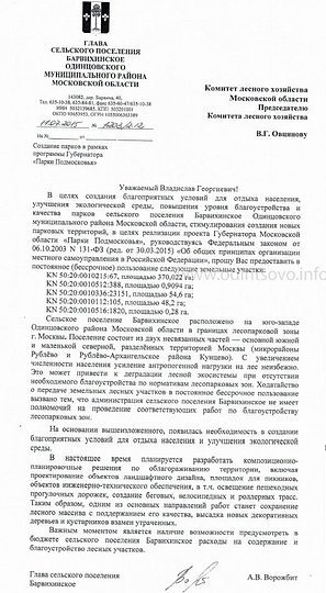 «Одинцово. Инфо» сообщает и о другом масштабном проекте управленца. В июле 2015 года года он пишет письмо на имя председателя комитета лесного хозяйства Московской области, в котором просит передать в постоянное пользование 400 (!) га лесных территорий.