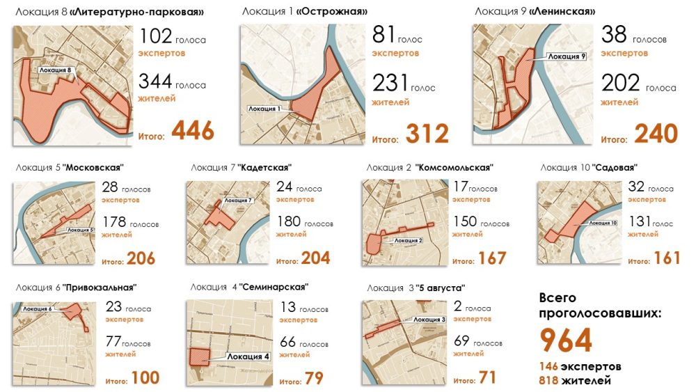 После и сами горожане имели возможность ознакомиться с презентационными стендами, расставленными по городу, задать свои вопросы экспертам и проголосовать за ту или иную локацию. В итоге наибольшее количество голосов набрала именно «литературно-парковая», которая включает в себя: территорию парка Победы, сквер «Дворянское гнездо», музей Лескова, улицу 7 Ноября, музеи Тургенева, Писателей-орловцев, Грановского, Бунина, Рябиновый сад, территорию памятника «Каховка». Собственно говоря, именно данные территории и описаны в пресс-релизе облправительства, размещённом накануне.