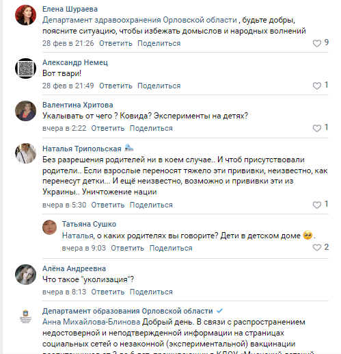 «В связи с распространением недостоверной и неподтвержденной информации на страницах социальных сетей о незаконной (экспериментальной) вакцинации воспитанников от 3 до 6 лет, проживающих в КДОУ «Мценский детский дом для детей-сирот и детей, оставшихся без попечения родителей, дошкольного возраста» в настоящее время и в ближайший период незаконная (экспериментальная) вакцинация воспитанников не проводится и проводиться не будет. Профилактические прививки воспитанников учреждения проводятся в соответствии с приказом Министерства здравоохранения РФ от 06.12.2021 г. № 1122».
