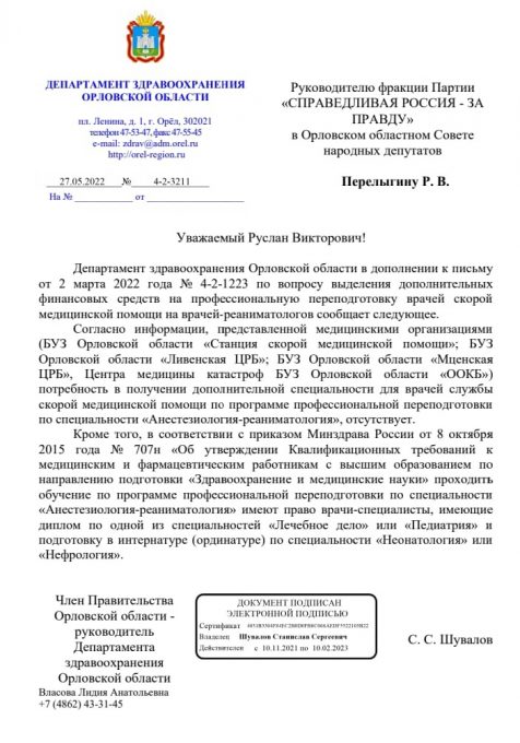 «Мы даже (неожиданно) получили одобрение на это. Однако время шло, а никаких подвижек с переобучением не происходило. Мы попросили написать депутатский запрос Руслана Перелыгина: когда же начнётся долгожданная учёба врачей СМП, большинство из которых хотели бы выучится на реаниматологов и работать в специализированных бригадах? И получили ответ, который поверг меня и моих коллег в шок», — добавляет Серёгин.