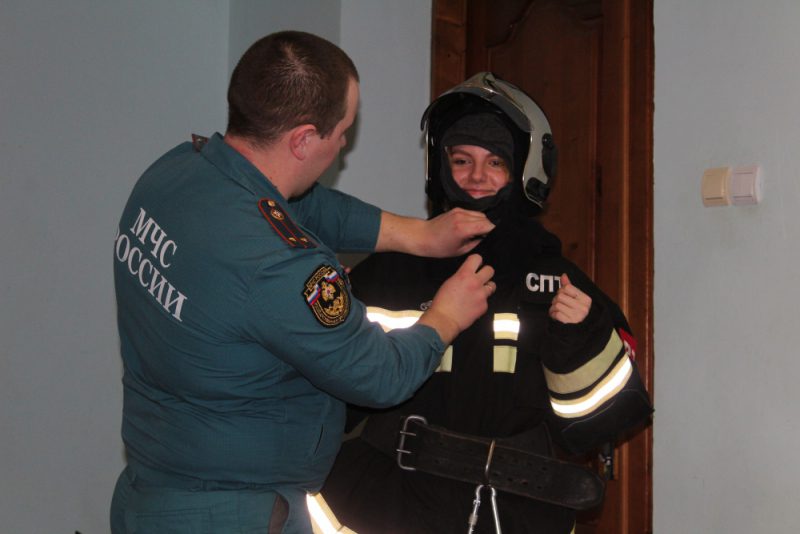 В рамках открытого урока студентам института культуры предоставили возможность примерить на себя боевую одежду пожарного и показали приёмы первой медицинской помощи.
