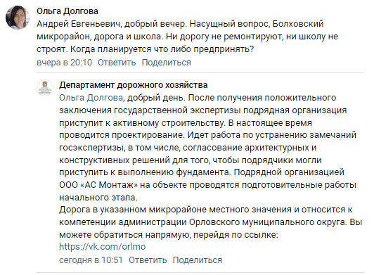 Проще говоря, с октября 2023 года работы не сдвинулись ни на йоту. При этом ответ профильного департамента практически слово в слово повторяет заявление замгубернатора по развитию инфраструктуры Владимира Ивановского, сделанного ещё осенью прошлого года. Тогда чиновник сообщил, что «документация подана на госэкспертизу. Но пока не определены точки подключения объекта к сетям временного электро- и водоснабжения». Примерно такой же ответ орловцы получили от власти и в июне 2023 года.