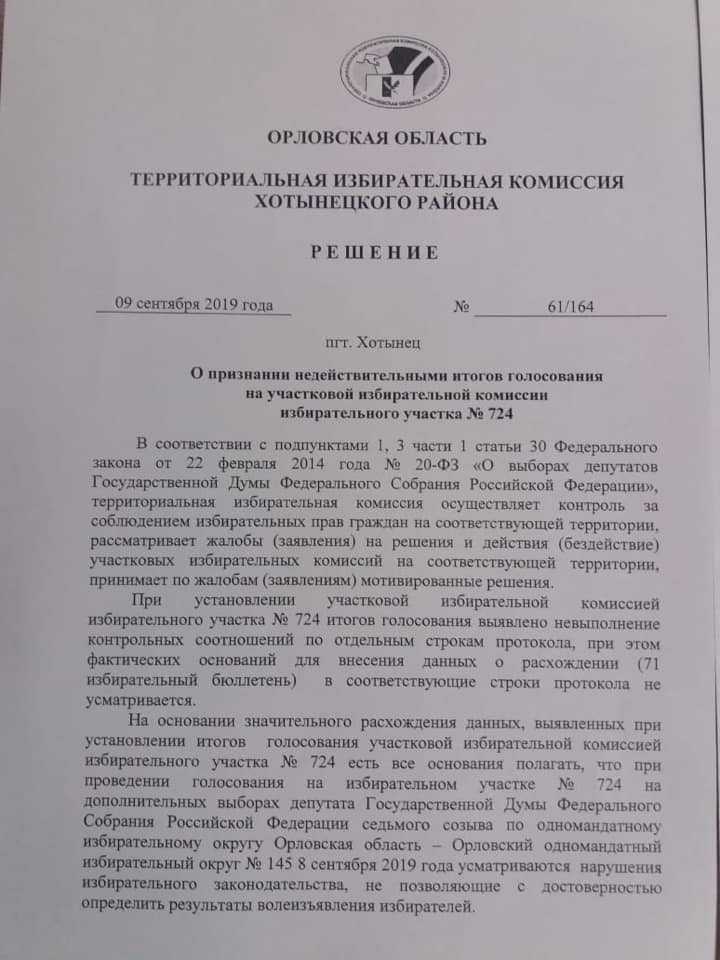 Территориальная избирательная комиссия Хотынецкого района региона признала недействительными результаты голосования на УИК №724.