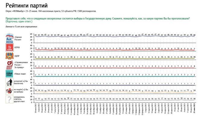 Фонд общественного мнения (ФОМ) опубликовал результаты опроса степени доверия жителей России к политическим партиям. Телефонный опрос проводился в 53 субъектах РФ. 41% респондентов на вопрос: «Если бы завтра состоялись выборы в Государственную думу, за какую партию Вы бы проголосовали», ответили: «Единая Россия». По лидеру нет изменений.