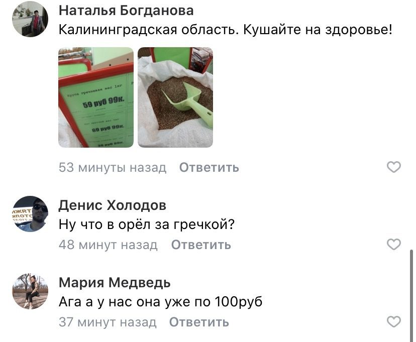 Автор поста уверяет, что гречки хватит на всех. В числе прочего, в комментариях пользователи паблика обсуждают стоимость крупы. Так, например, где-то гречку продают уже по 100 рублей.