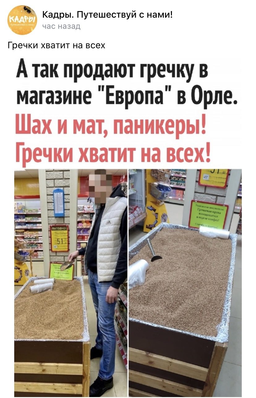Группа выложила фотографию, как любимая многими крупа продаётся в одном из местных магазинов. На фото гречки, которой пару недель назад активно запасались местные жители, в прямом смысле валом.