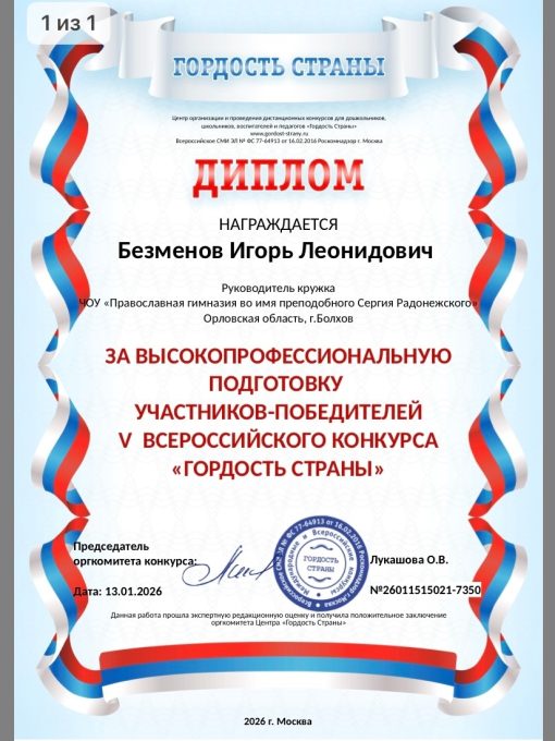 Успешное наставничество Безменова также отмечено Дипломом «За высокопрофессиональную подготовку участников-победителей пятого Всероссийского конкурса «Гордость страны». От всей души поздравляем Игоря с этой высокой оценкой его труда.