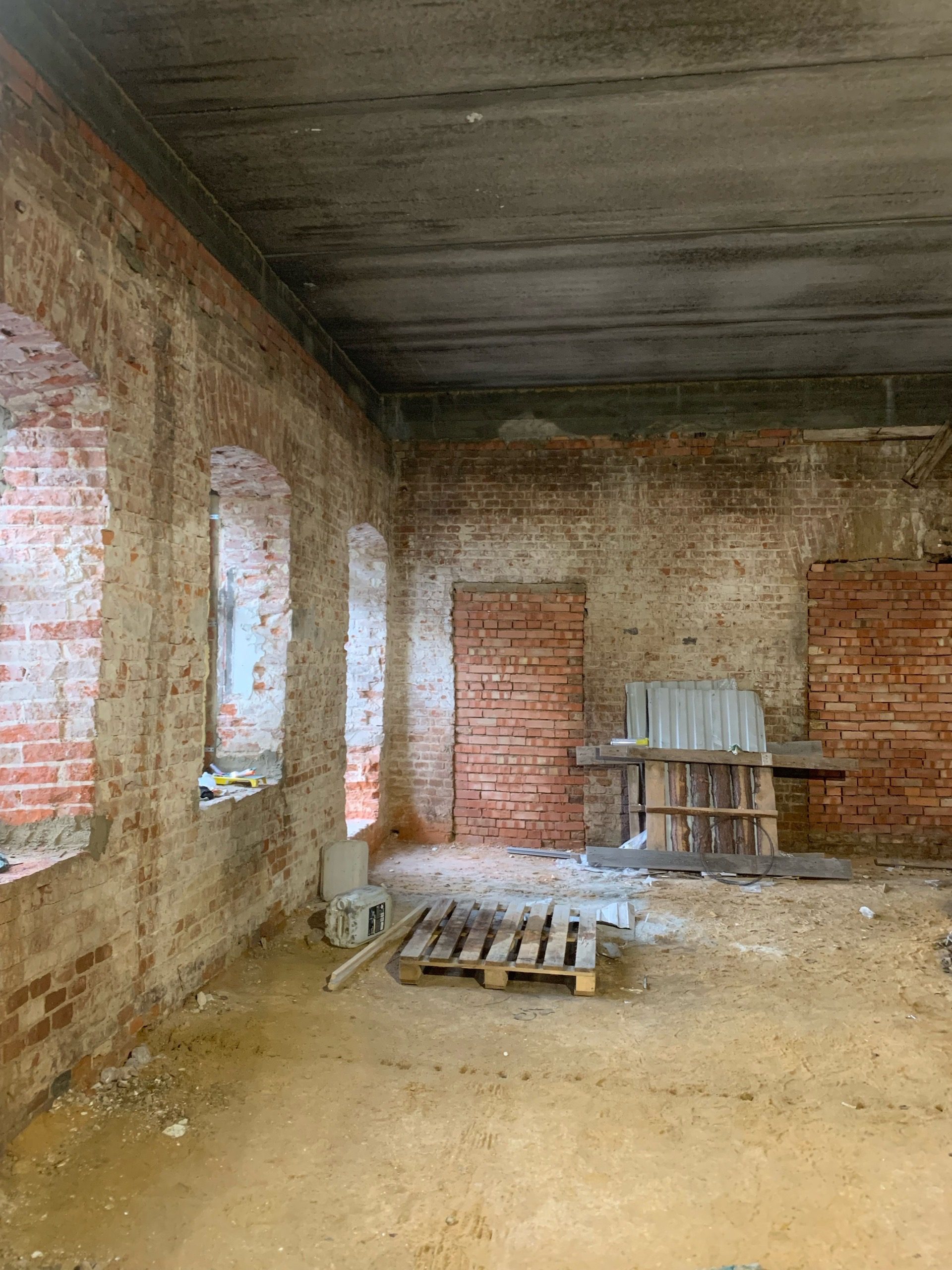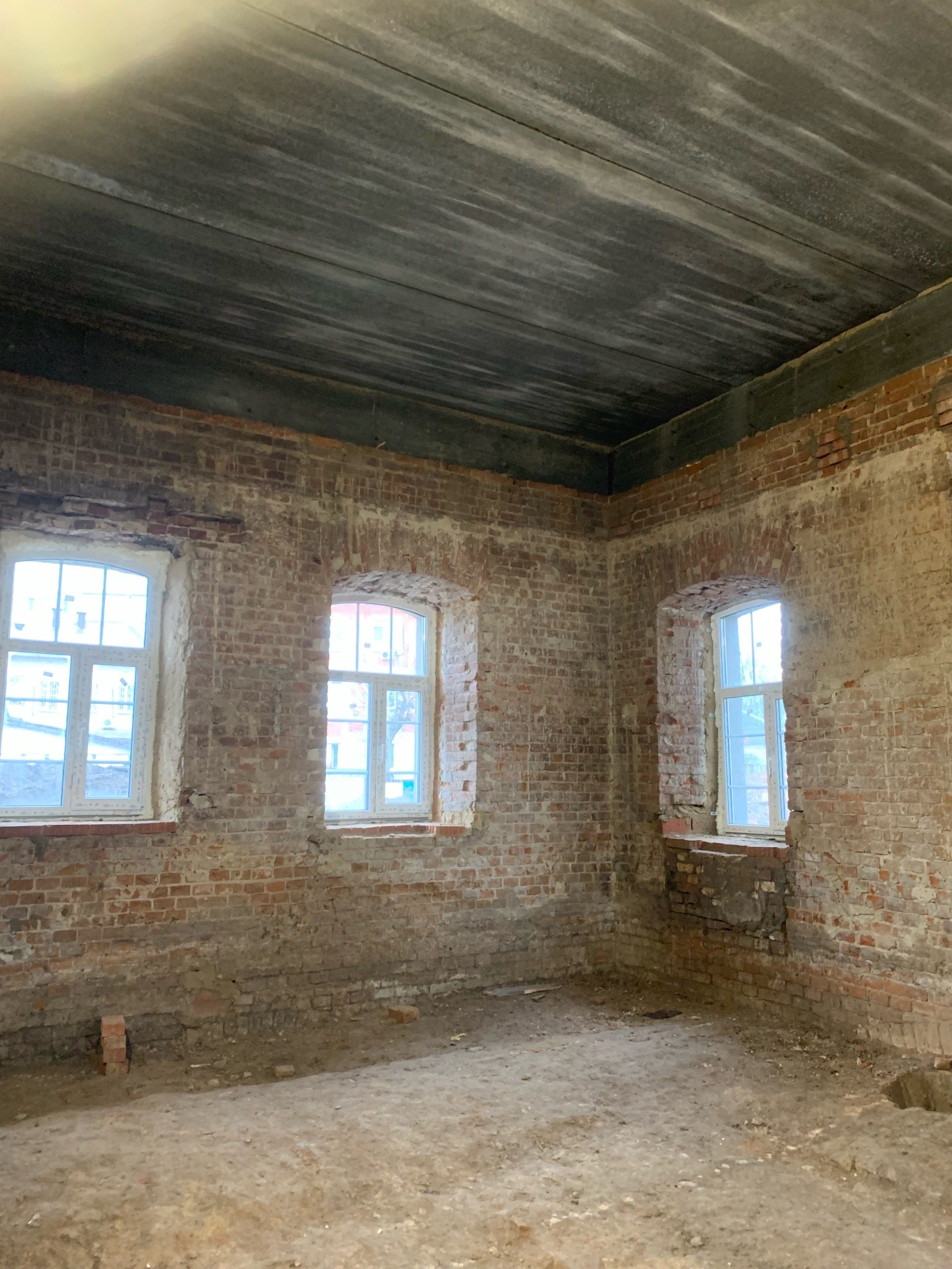 На первом этаже работы по восстановлению фасада тоже завершены – там пришлось наращивать кирпичную кладку, которая местами оказалась разрушена. К началу декабря уже полностью установлены окна на двух этажах. Ведутся работы по возведению мансардного этажа.