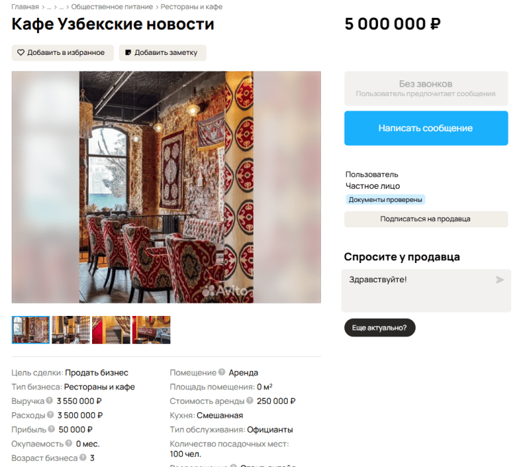 Кроме того, неделю назад на известном сайте объявлений появилась информация о продаже ресторана. Владелец готов продать бизнес за 5 млн рублей.