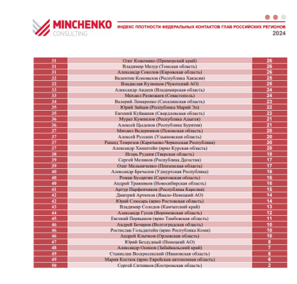 Коммуникационный холдинг «Минченко Консалтинг» представил «Индекс плотности федеральных контактов глав российских регионов» по итогам 2024 года. Рейтинг отражает степень активности взаимодействия губернаторов с федеральными политиками и управленцами.