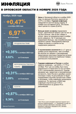 Смотря на картину глобально, банковские эксперты отмечают, что годовая инфляция а регионе замедляется шестой месяц подряд. В ноябре в Орловской области она составила 7%.