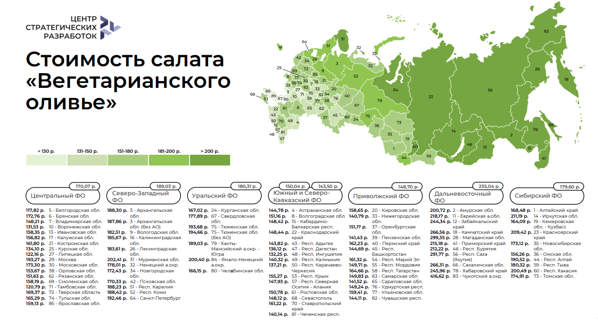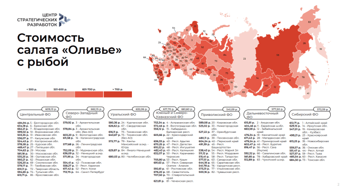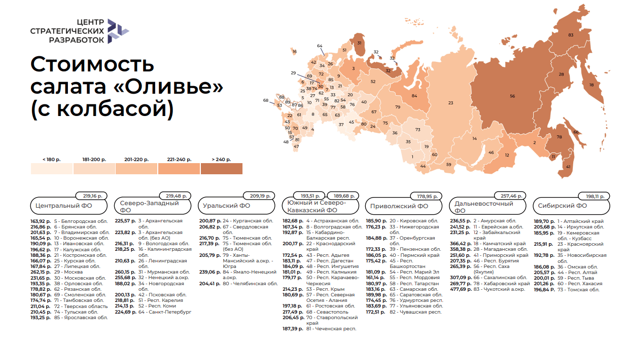 Специалисты Центра стратегических разработок (ЦСР) подсчитали так называемый «Индекс «Оливье»». Это изменение цены порции в 800 г на семью из 3-4 человек, которую фиксируют из года в год.
