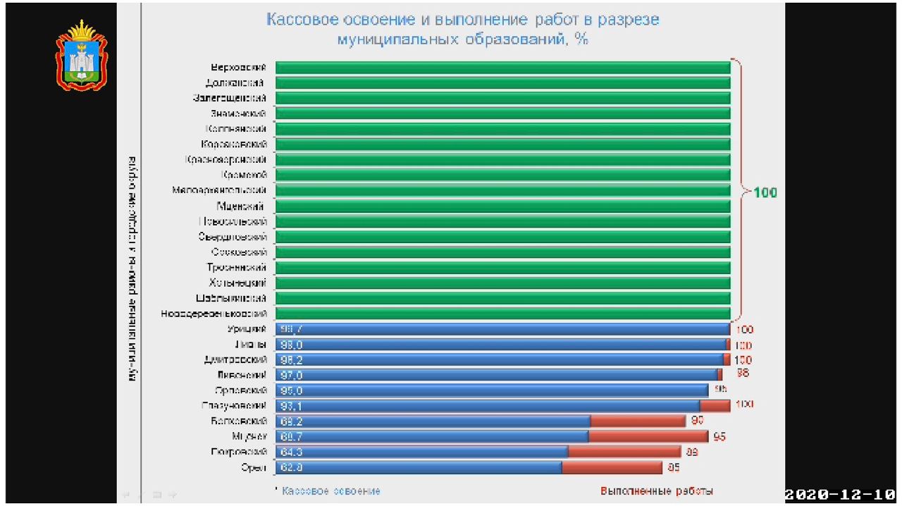 «Кассовые расходы на реализацию муниципальных проектов превысили 1 млрд 451 млн рублей. 100% освоили в 17 муниципальных образованиях. Ещё по целой группе муниципалитетов освоено 93-99% средств. По-прежнему чуть менее 70% освоили во Мценске и Болховском районах. Свыше 60% – город Орёл и Покровский район»,— обрисовал общую картину глава области.